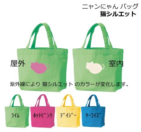 ニャンにゃん バッグ 猫シルエット Sサイズ は、猫好きの方にぴったりのバッグです。太陽光によって、猫シルエットのカラーが変化するのが特徴です。明るい日中、屋外ではピンクパープルに変わり、室内に入るとホワイトカラーになる楽しい仕掛けがあります。