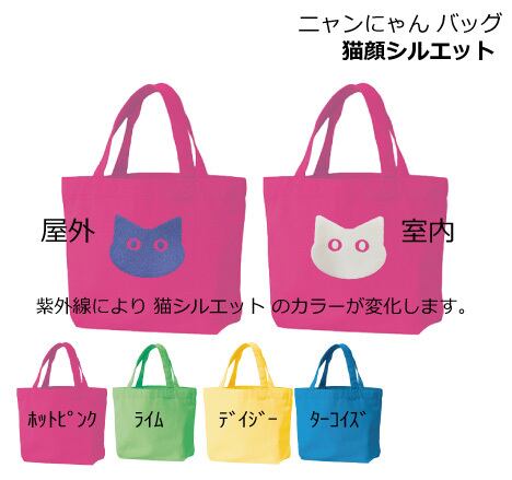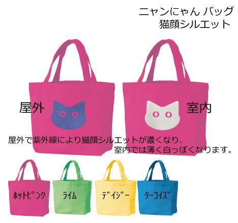ニャンにゃんバッグは、かわいらしい猫の顔シルエットが特徴のバッグです。猫好きの方にピッタリのデザインで、可愛らしい見た目が愛される理由です。さらにこのバッグは、猫の顔シルエットのカラーが変化する特長があります。室内ではホワイト、屋外(UV)ではネイビーに変化します。